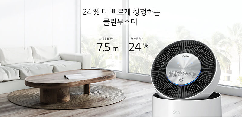 Máy lọc không khí LG Puricare 360 AS280DWFC hút và xả không khí 360 độ độc đáo mang đến hiệu quả vượt trội. Quạt gió đẩy không khí sạch lên khoảng cách 7.5 m, làm sạch sâu từng ngóc ngách trong thời gian ngắn.