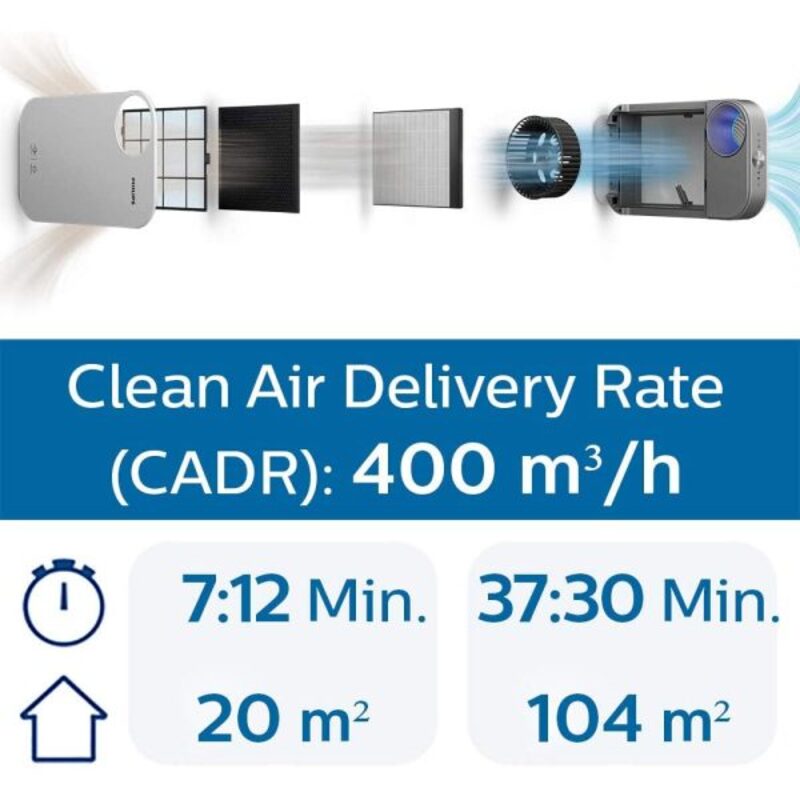 Nhờ hiệu suất làm sạch cao CADR (Tỷ lệ phân phối không khí sạch) 400 m³/h, máy lọc không khí Philips AC4550/10 có thể kiểm soát và làm sạch hoàn toàn một căn phòng 20m² trong vòng 8 phút. Máy cũng có thể làm sạch các căn phòng có diện tích lên đến 104 m².