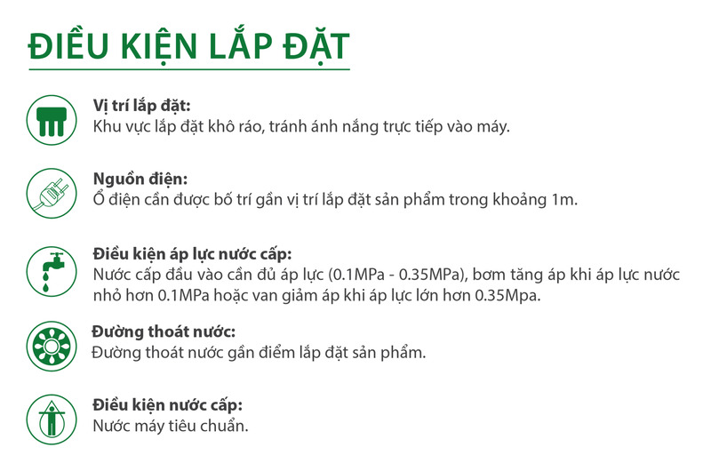 - Áp suất nước cấp phù hợp: 0.1MPa ~ 0.35MPa