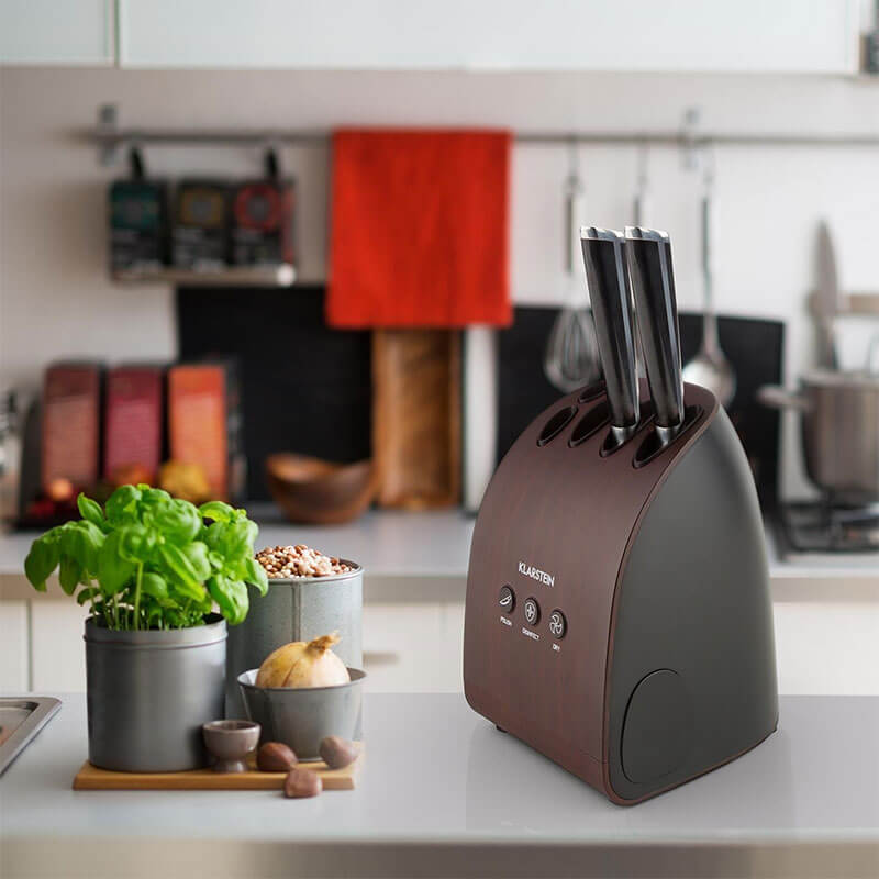 Thiết kế phân gỗ Veneer gỗ tối màu, máy mài dao điện Klarstein Miss Knife thích hợp một cách hoàn hảo cho không gian bếp.