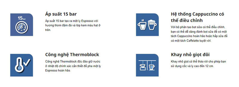 – Công nghệ Thermoblock độc đáo giữ nước ở nhiệt độ chính xác cần thiết để pha một ly Espresso hoàn hảo.
