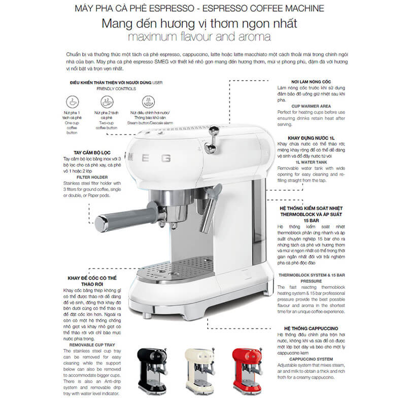 – Các cà phê Ý truyền thống mê hoặc tất cả các những người yêu thích cà phê . Máy pha cà phê Smeg Espresso có thể được sử dụng với cả cà phê xay.