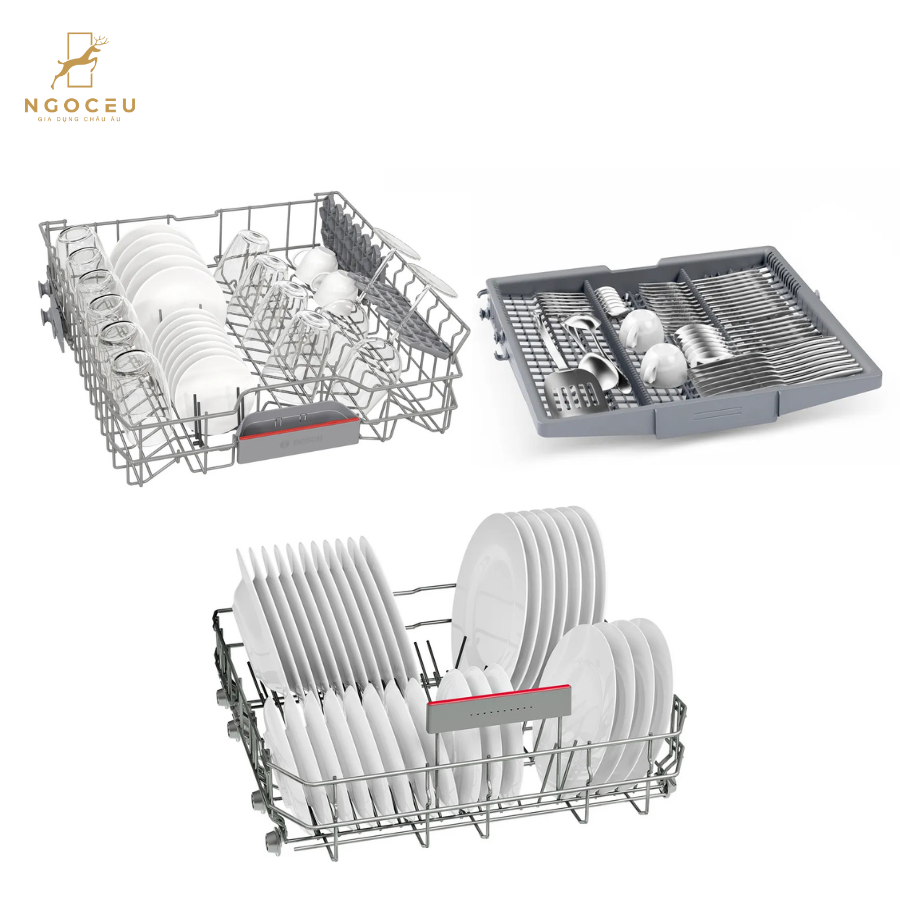 - 2 Giàn rửa + 1 ngăn kéo: Hệ thống giàn rửa của Máy rửa bát Bosch SMV6ZCX10E gồm có 1 ngăn kéo và 2 giàn rửa (gọi là giàn trên và giàn dưới). Ngăn kéo trên cùng để chứa dụng cụ nhỏ như dao, kéo, đũa, ly nhỏ. Giàn trên để chứa chén bát, đĩa, ly loại cỡ vừa. Giàn dưới để chứa các dụng cụ lớn như nồi chảo, thớt, rổ, bát tô, đĩa cỡ lớn. Máy có sức chứa lên tới 14 bộ chén bát, phù hợp cho gia đình từ 4-6 thành viên.