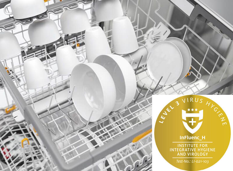 Làm sạch bát đĩa của bạn một cách hợp vệ sinh với Miele: Hơn 99,9% vi rút (ví dụ: coronavirus, vi rút cúm hoặc norovirus) đã được loại bỏ bằng công nghệ PowerDisk và viên rửa bát UltraTabs. Hơn 99,99% vi khuẩn (Enterococcus faecium) đã được loại bỏ bằng công nghệ AutoDos và PowerDisk trong các chương trình ECO với độ nóng của nước là 50 ° C và QuickPowerWash với độ nóng của nước là 65 ° C. Hơn nữa, các chương trình rửa đảm bảo vệ sinh đã giảm tải lượng vi khuẩn (Enterococcus faecium hoặc Micrococcus luteus) xuống ít nhất 10.000 lần, ngay cả khi không dùng chất tẩy rửa. Vậy nên bạn có thể yên tâm rửa những vật dụng như bình sữa trẻ em.