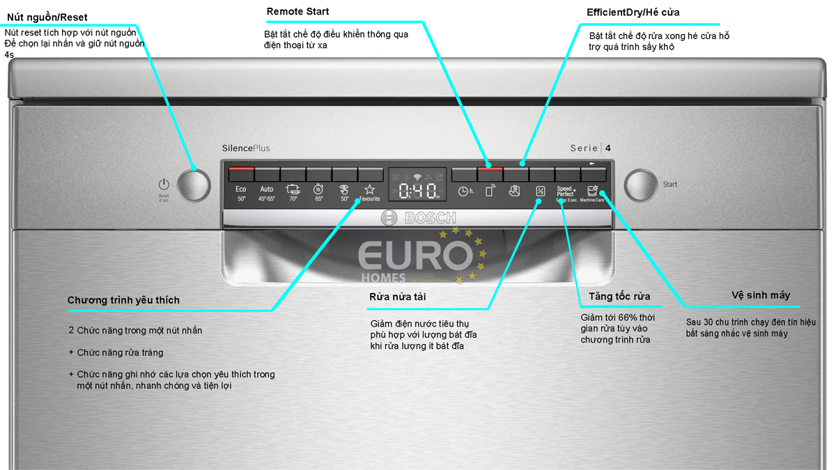 - 4 tính năng rửa thêm: Home Connect, tăng tốc, một nửa, sấy hiệu quả