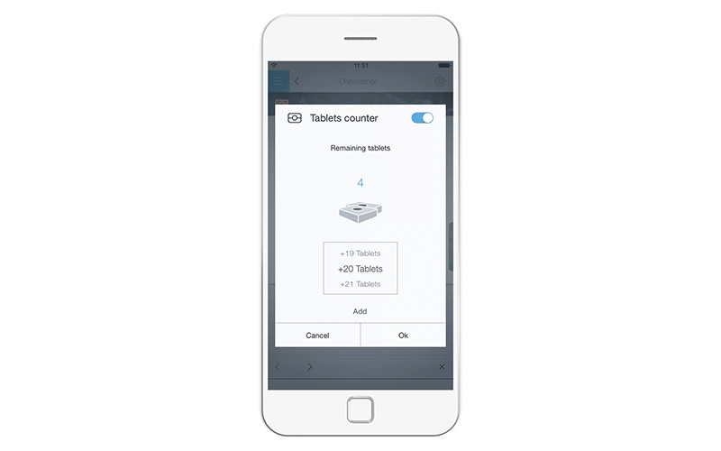 Chức năng đếm và cảnh báo hết viên tẩy rửa trên ứng dụng HomeConnect sẽ đăng ký mức tiêu thụ của bạn và tự động thông báo khi bạn chỉ còn 5 viên tẩy rửa.