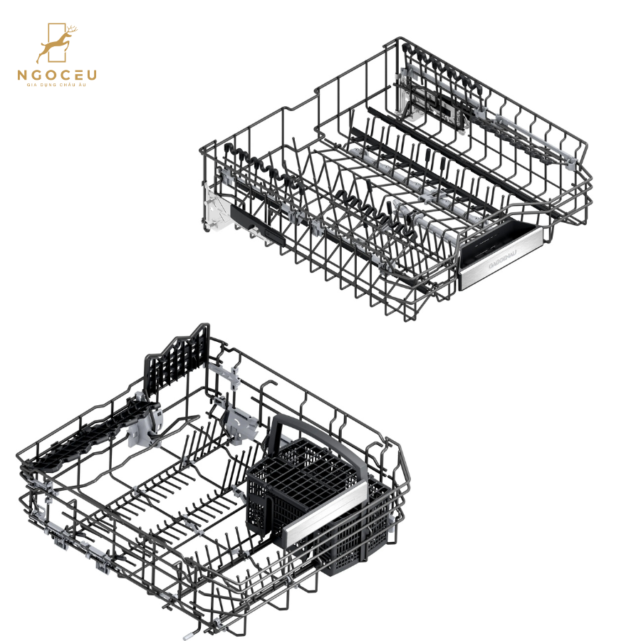 - Thiết kế & Nội thất: Giỏ trên điều chỉnh 3 mức, linh hoạt với nhiều kích cỡ chén đĩa, có vùng rửa mạnh bổ sung. Giỏ dưới linh hoạt với hệ thống chia ngăn bảo vệ ly. Sức chứa 12 bộ chén đĩa, tối đa 23 ly rượu.
