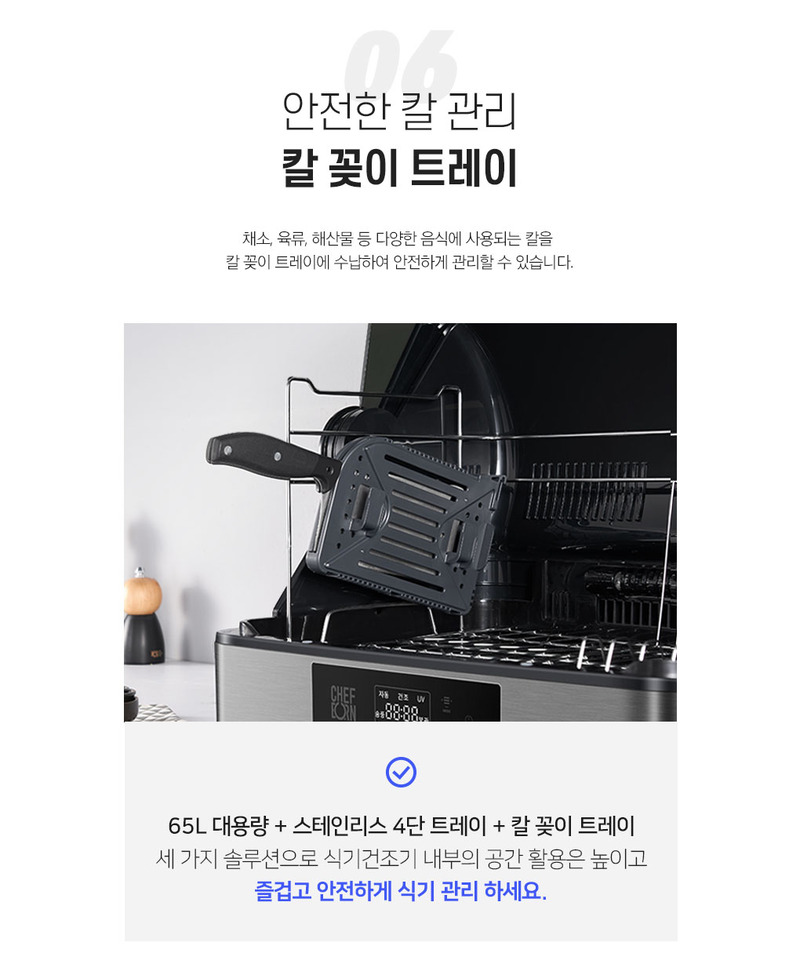 Với dung tích 65L rất tiện lợi, không gian lưu trữ lớn giúp tiệt trùng nhiều bát đĩa, đũa thìa và các loại dụng cụ nấu ăn lớn.