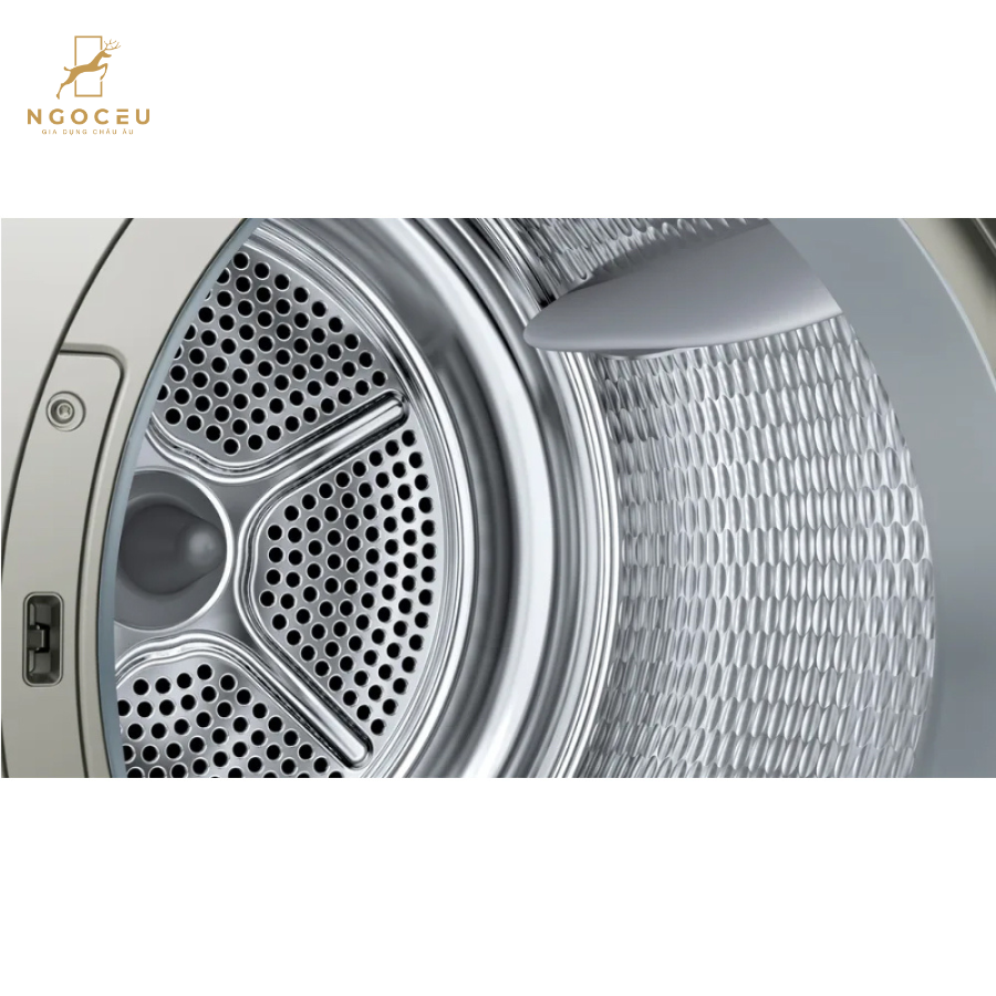 - Thiết kế: Kiểu dáng: Máy sấy lồng ngang - cửa trước. Bảng điều khiển: Máy sấy Bosch này có bàn phím cảm ứng, núm vặn lựa chọn chương trình sấy và màn hình LED hiển thị các thông số giúp người dùng dễ dàng quan sát và thao tác tùy chỉnh. Lồng sấy làm bằng thép không gỉ bóng bẩy, chống rỉ sét, mài mòn, hạn chế bụi bẩn, mảng bám, giúp nâng cao tuổi thọ cho thiết bị.