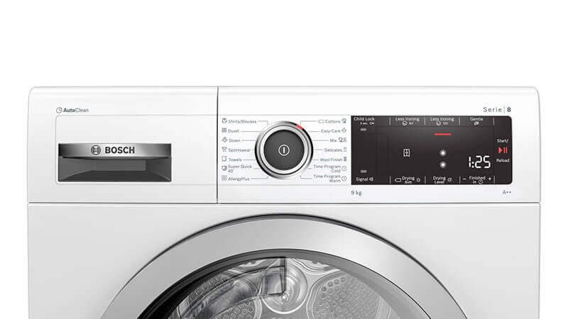 Máy sấy bơm nhiệt AutoClean cao cấp với chức năng SmartDry và IronAssist: dễ dàng xử lý quần áo cần sấy bằng các chương trình hoàn toàn tự động.