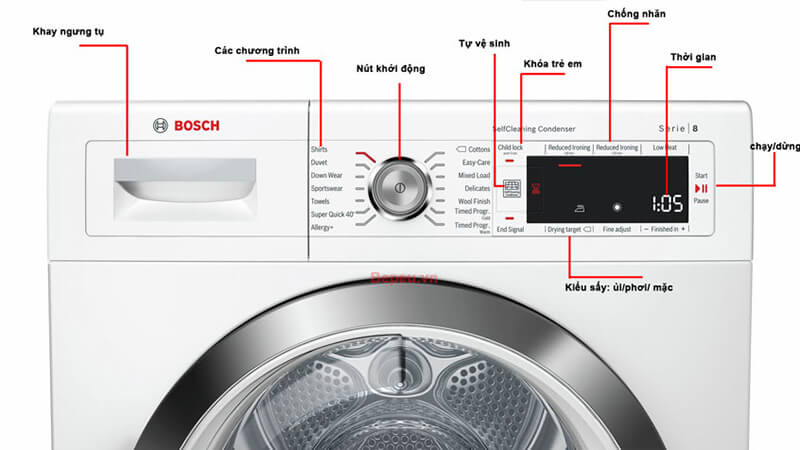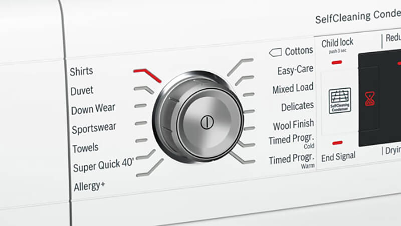 Điều khiển cảm ứng xoay tròn với cảm biến chương trình và thời gian chương trình+ Chương trình đặc biệt: Woollens, Mixed Load, Towels, Duvet, Timed programme warm, Timed programme cold, Cottons, Easy-Care, Allergy +, Sportswear, Down, Super Quick 40, Shirts/blouses, Delicates+ Các nút cảm ứng: Low heat, Buzzer, start/pause, Drying aim, Power button, fine-tuning for drying level, Child lock 3 sec., Reduced ironing 60 mins, Reduced ironing 120 mins, 24 h end Time Delay