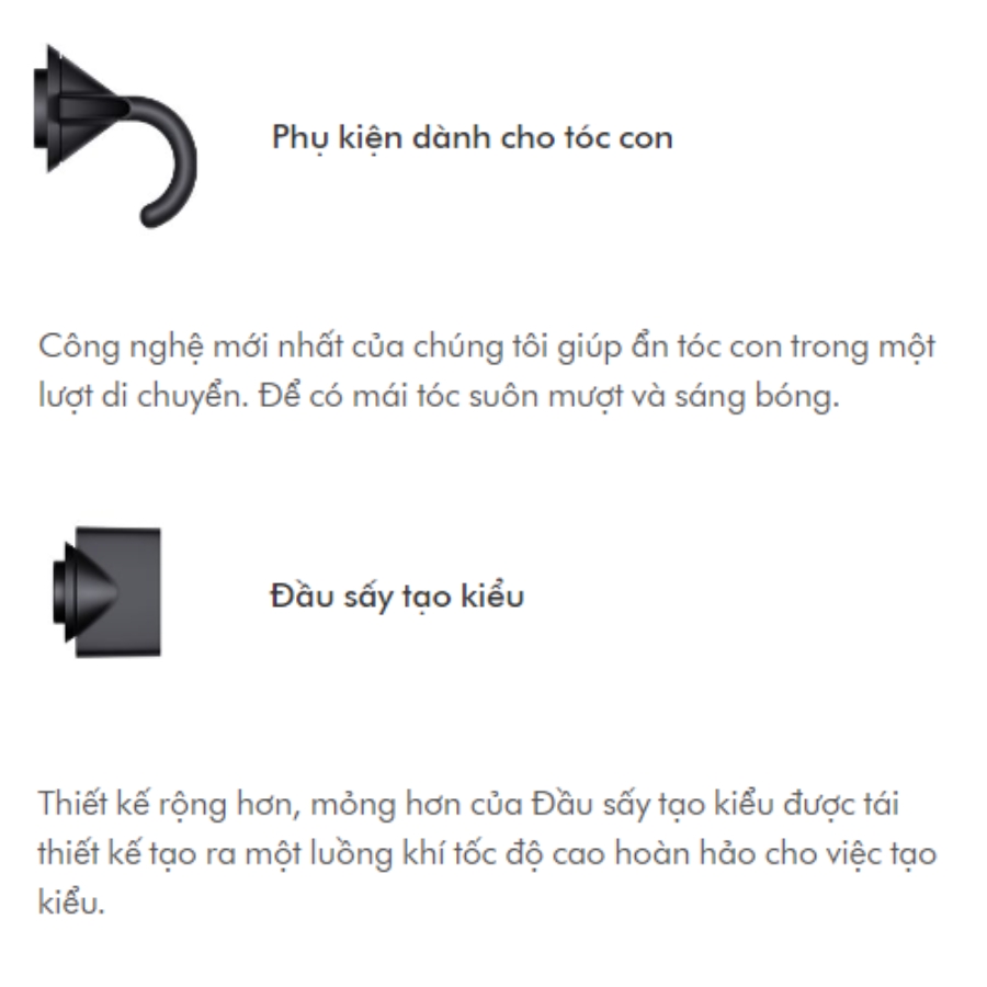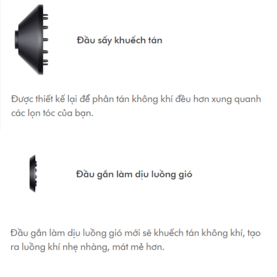 - Được thiết kế để thân thiện hơn với tóc mỏng và da đầu nhạy cảm, phụ kiện không khí nhẹ nhàng mới khuếch tán không khí, tạo ra luồng không khí nhẹ nhàng, mát mẻ hơn – trong khi vẫn làm khô tóc nhanh chóng.