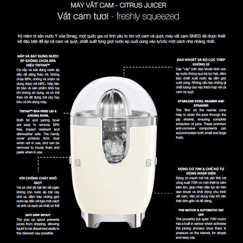 Cong và bùng nổ cá tính, máy ép Citrus của Citeg là một lễ kỷ niệm di sản Ý của Smeg một quốc gia có tình yêu lớn với các loại trái cây họ cam quýt. Hiệu quả tối đa động cơ 70W mạnh mẽ với cảm biến tích hợp: quá trình ép nước bắt đầu một khi có áp lực lên mũi doa, để sử dụng dễ dàng và không cần nỗ lực . Hệ thống vòi thép không gỉ vòi phân phối nước trái cây trực tiếp vào cốc. Nâng lên để làm gián đoạn dòng chảy và ngăn chặn nhỏ giọt .