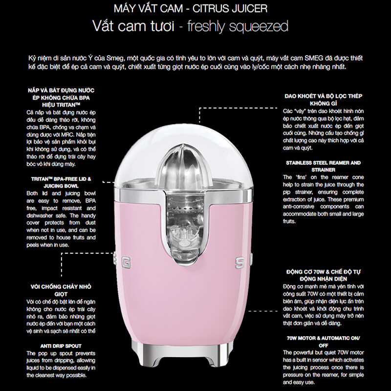 Cong và bùng nổ cá tính, máy ép Citrus của Citeg là một lễ kỷ niệm di sản Ý của Smeg một quốc gia có tình yêu lớn với các loại trái cây họ cam quýt. Hiệu quả tối đa động cơ 70W mạnh mẽ với cảm biến tích hợp: quá trình ép nước bắt đầu một khi có áp lực lên mũi doa, để sử dụng dễ dàng và không cần nỗ lực . Hệ thống vòi thép không gỉ vòi phân phối nước trái cây trực tiếp vào cốc. Nâng lên để làm gián đoạn dòng chảy và ngăn chặn nhỏ giọt .