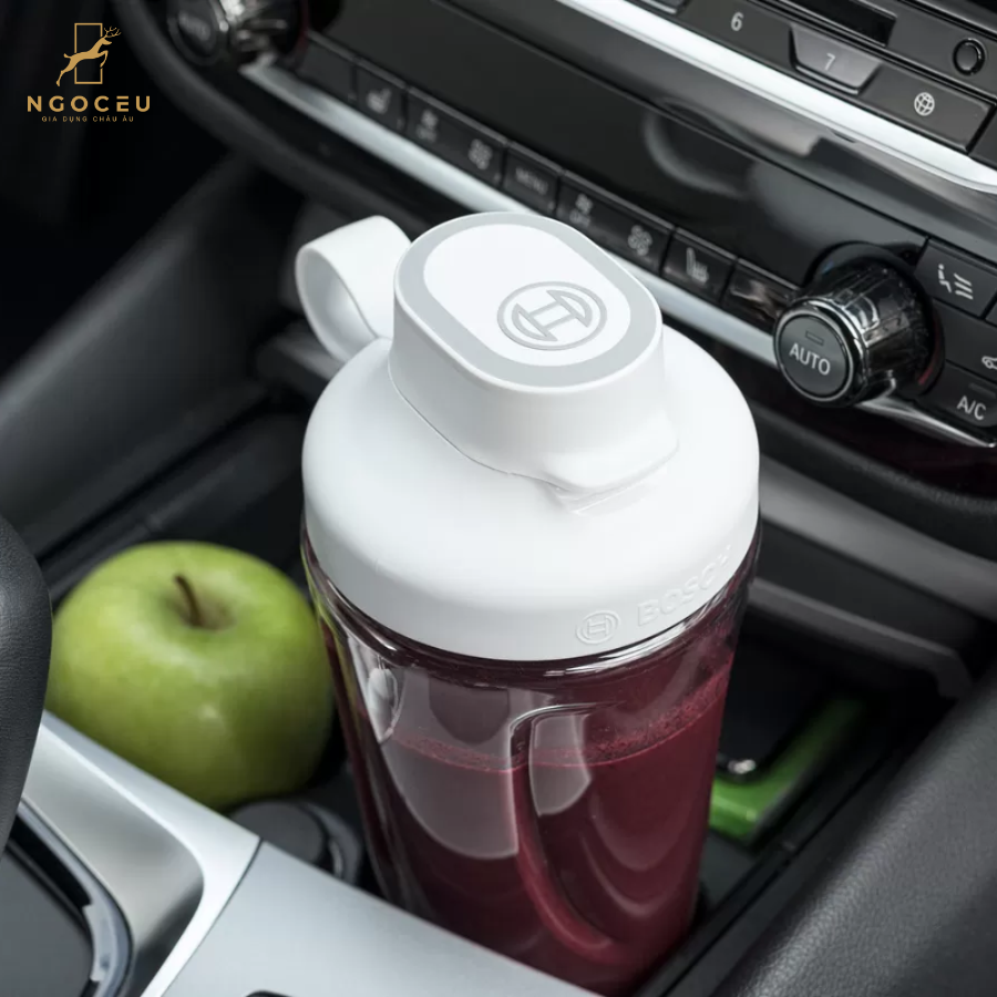 - Thưởng thức sinh tố khi đang di chuyển: Tiết kiệm thời gian nếu sinh tố được trộn trực tiếp trong cốc ToGo và sử dụng một hộp chứa khác, vì không cần gạn. Bình có thể tích sử dụng là 0,6l và được làm bằng Tritan không chứa BPA. Chức năng chống nhỏ giọt SafeLock, một cơ chế an toàn độc đáo, ngăn không cho chai vô tình mở ra và chất bên trong tràn vào động cơ truyền động. Ngoài ra, nắp bình ToGo có khả năng chống rò rỉ.