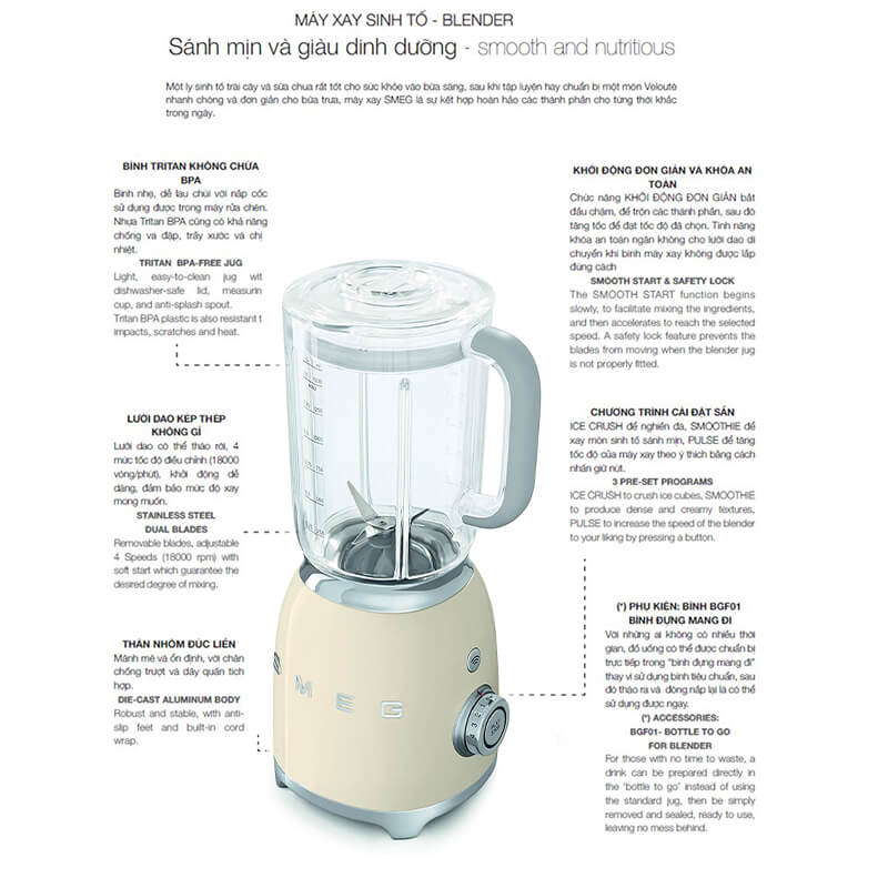 Sinh tố rất tốt cho sức khỏe. Để có một ly sinh tố trái cây và sữa chua tốt cho bữa sáng, để phục hồi với một thức uống giải khát sau khi tập luyện, hoặc để chuẩn bị một món súp nhanh chóng và đơn giản cho bữa trưa , Smeg pha trộn các thành phần của các kết cấu khác nhau để hoàn hảo, đi cùng bạn suốt cả ngày.