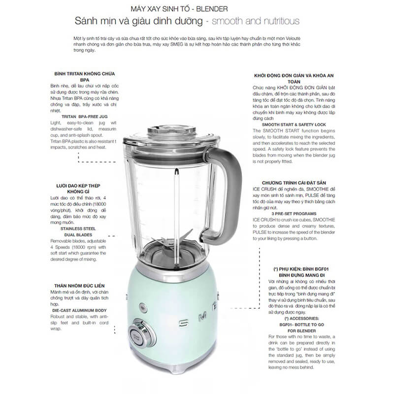 Sinh tố rất tốt cho sức khỏe. Để có một ly sinh tố trái cây và sữa chua tốt cho bữa sáng, để phục hồi với một thức uống giải khát sau khi tập luyện, hoặc để chuẩn bị một món súp nhanh chóng và đơn giản cho bữa trưa , Smeg pha trộn các thành phần của các kết cấu khác nhau để hoàn hảo, đi cùng bạn suốt cả ngày.