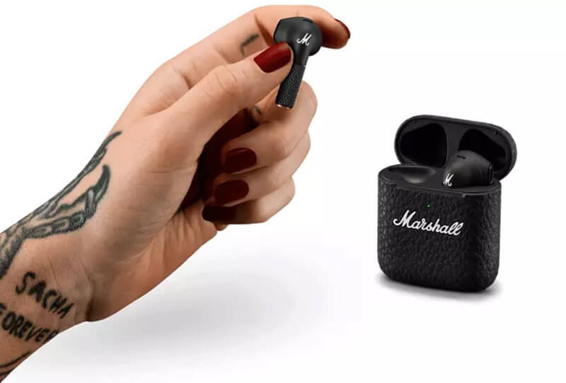 Có kiểu dáng khá tương đồng với Apple AirPods. Chúng có thiết kế với màu đen đặc trưng của Marshall và thân tai nghe có khía, đế màu đồng thau và phía trên là logo chữ “M” màu trắng.