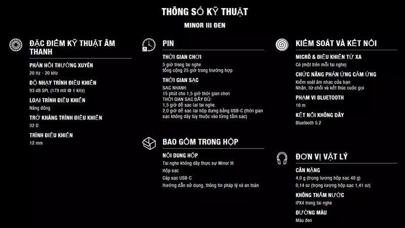 Minor III thực sự không dây, mang đến cho bạn sự tự do tuyệt đối khi nghe mà không cần dây, trong khi vẫn mang lại âm thanh mạnh mẽ. Minor III đi kèm với Bluetooth 5.2, đảm bảo rằng tai nghe có kết nối mạnh mẽ với thiết bị của bạn.