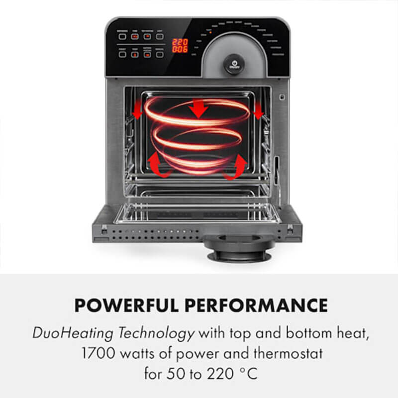 – Điểm nổi bật của nồi chiên không dầu Klarstein Aero Vital Cube 14l chính là công nghệ Dual Heating với hệ thống là nóng nhiệt trên và dưới, bạn có thể nấu ăn thoải mái và đa dạng các món nướng, quay và chiên thực phẩm. Nhiệt từ các bộ phận trên và dưới được làm nóng nhanh chóng và tối ưu nhờ quạt không khí tuần hoàn ở phía trên, thực phẩm sẽ được nấu chín một cách dễ dàng và nhanh chóng.