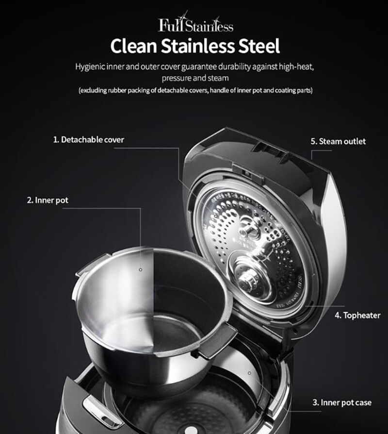 Nắp vung sử dụng công nghệ Full Stainless OneTouch vật liệu chịu áp suất cao không gỉ, có thể tháo rời vệ sinh thay rửa dễ dàng và linh hoạt