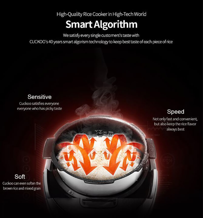 Công nghệ nấu Áp suất cao tần IH (2 atmospheric pressure) giúp lượng nhiệt gia tăng ổn định và đều khắp nồi giúp hạt gạo chín đều từ mọi mặt, sâu lõi hạt gao ra ngoài, tạo ra chất lượng cơm chín kỹ, dền cơm và hương vị thơm ngon hơn.