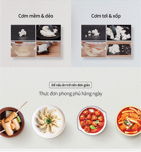 – Nấu cơm, nấu nhanh, nấu cơm trộn,nấu ngũ cốc nấu cơm làm kimbap, nấu cơm dinh dưỡng, nấu cơm gạo lứt, nấu xôi …
