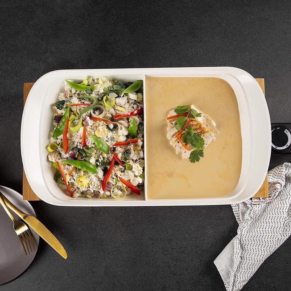 - Nhờ sự phân chia độc đáo ở giữa nồi, bạn có thể chế biến hai món ăn cùng một lúc. Bạn có thể sử dụng một mặt cho thịt, cá hoặc rau và mặt kia cho cơm, khoai tây hoặc bánh mì. Hoặc cho 2 khoang lẩu khác nhau.