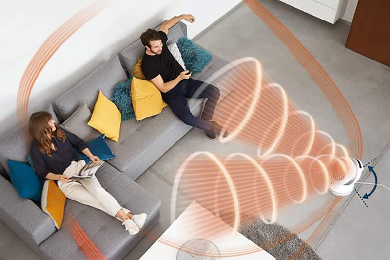 Mức âm thanh chỉ 43dB ở chế độ quạt ở tốc độ tối thiểu, cho bạn sự an tâm sử dụng khi không ảnh hưởng đến các sinh hoạt thường ngày của bạn. Bên cạnh đó quạt được thiết kế có thể điều chỉnh được góc quay lên đến 90 độ giúp không khí lưu thông tốt hơn.