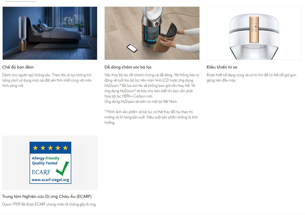 - Các máy lọc không khí của Dyson đã được chứng nhận phù hợp với người bị hen suyễn và dị ứng bởi Allergy Standards Limited.