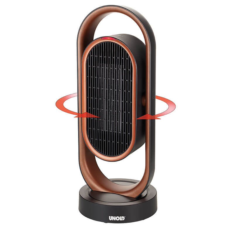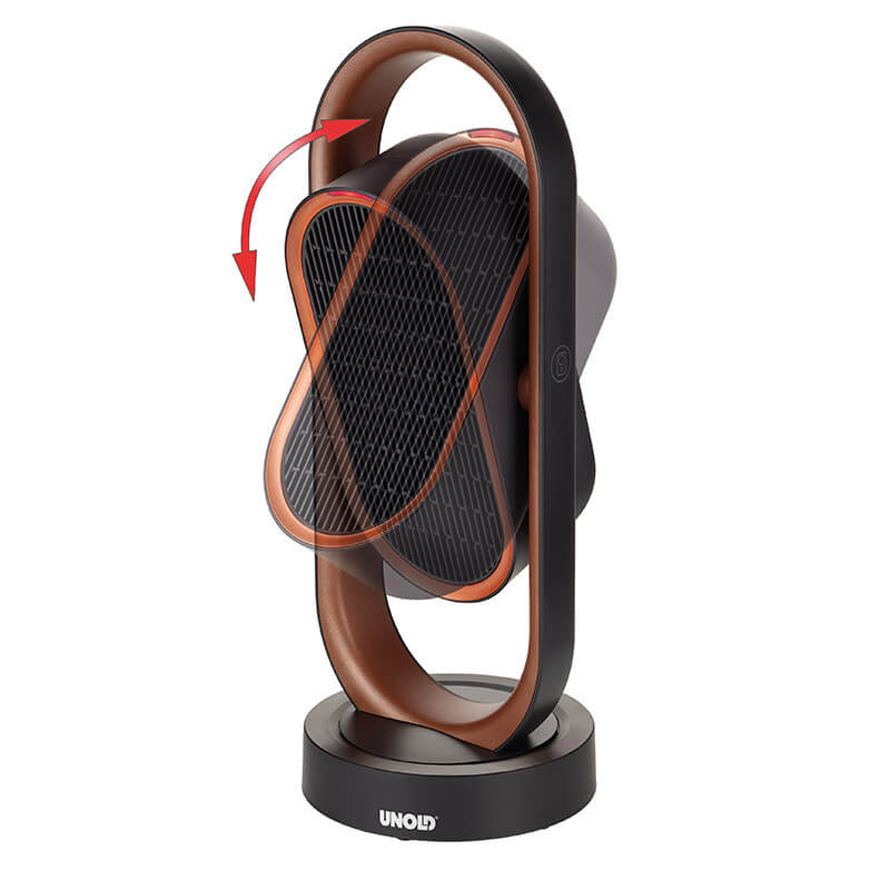 Đặc điểm sản phẩm Quạt sưởi gốm 3D Ceramic Unold có điều khiển từ xa có từ tính. Màu đồng/đen thanh lịch, dễ chịu cho căn phòng nhà bạn.Thiết kế dạng quạt đứng thẳng như quạt ko cánh, có thể xoay ngang 80 độ, góc nghiêng lên xuống 45 độ giúp hơi ấm lan tỏa đều khắp phòng.