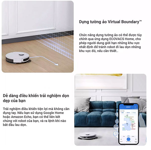 – Bạn muốn khoanh vùng những khu vực không cho robot đi vào, với chức năng Virtual Boundary™ tường ảo thông minh bạn có thể làm điều này dễ dàng đơn giản trên App Ecovacs Home, mọi tùy chỉnh thật dễ dàng theo ý bạn.