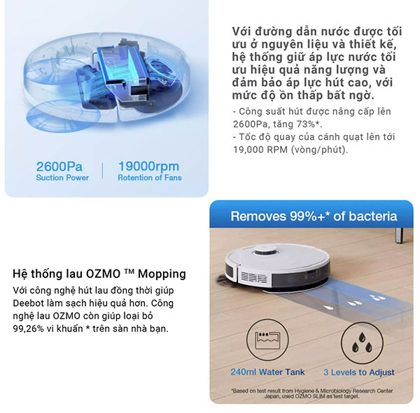 – Hút và lau 2 trong 1 mang đến cho bạn trải nghiệm làm sạch toàn diện tối ưu hơn, đặc biệt với việc nâng cấp lực hút 2600pa N8 thực sự đem đến hiệu năng hút cực mạnh, kết hợp với hệ thống lau thông minh OZMO