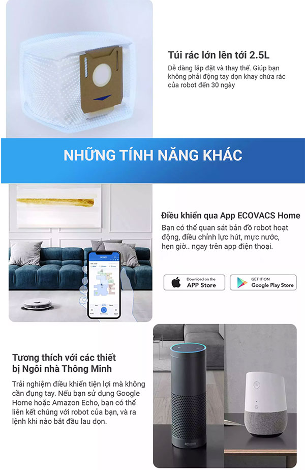 – Deebot N8 Pro cho bạn tuỳ chọn với đế sạc xả rác tự động với dung tích túi đựng dự trữ lên tới 2,5L, điều này tiện lợi nếu bạn thực sự bận không muốn đổ rác liên tục.