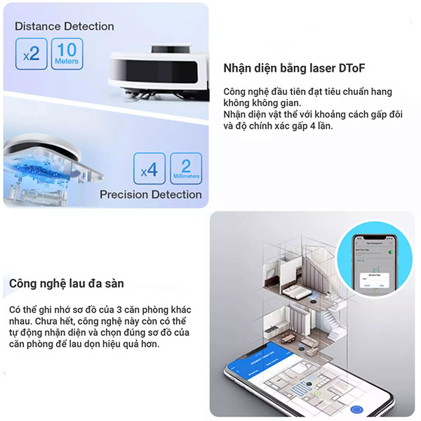 – Deebot N8 Pro được trang bị hệ thống điều hướng và thiết lập bản đồ TrueMapping ứng dụng thuật toán DToF- công nghệ laser ứng dụng trong hàng không vũ trụ giúp robot xác định đươc vật thể xa hơn gấp 2 lần và lập bản đò chính xác hơn 4 lần thế hệ trước.