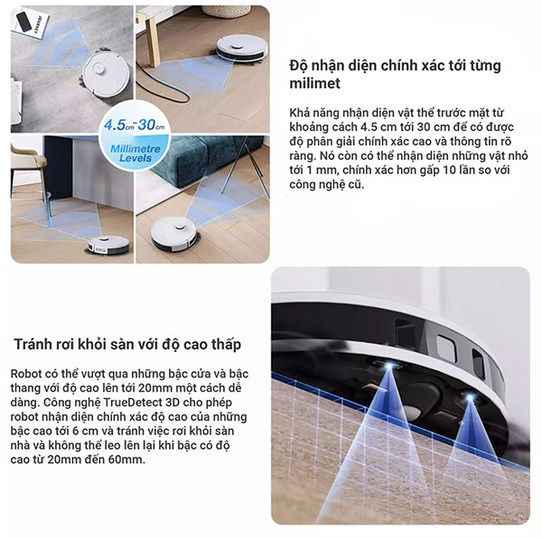 – So với việc quét hồng ngoại truyển thống thì công nghệ TrueDetect 3D nhận dạng vật thể chính xác gấp 10 lần và có thể nhận nhận những vật nhỏ cỡ mm, Deebot N8 Pro có thể nhận dạng được: dây điện, dép, đồ vật nhỏ như đồ chơi…giúp robot điều hướng và hiểu môi trường tốt hơn, di chuyển tối ưu hơn.