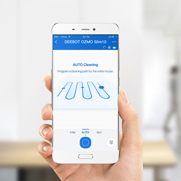 – Với ECOVACS App trong thiết bị di động của bạn, bạn có thể dễ dàng lên lịch thời gian dọn dẹp và thiết lập các chế độ làm sạch, theo dõi tình trạng làm sạch, và tận hưởng mọi tiện ích của việc dọn dẹp hoàn toàn tự động.