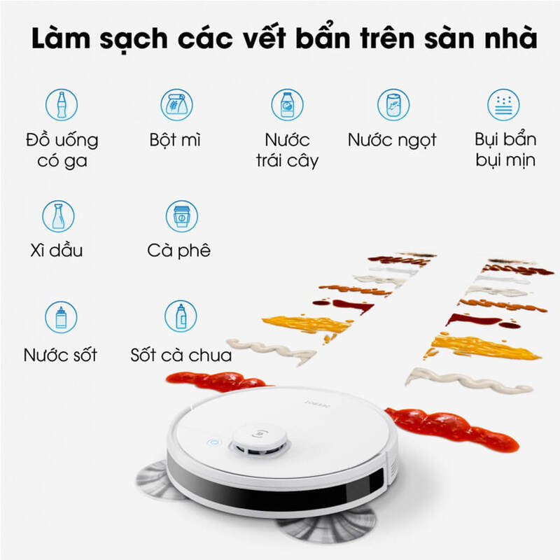 - Robot có khả năng làm sạch nhiều loại vết bẩn cứng đầu: nước soda, bột mì, nước trái cây, nước ngọt, bụi bẩn, xì dầu, cà phê, nước sốt, sốtcà chua
