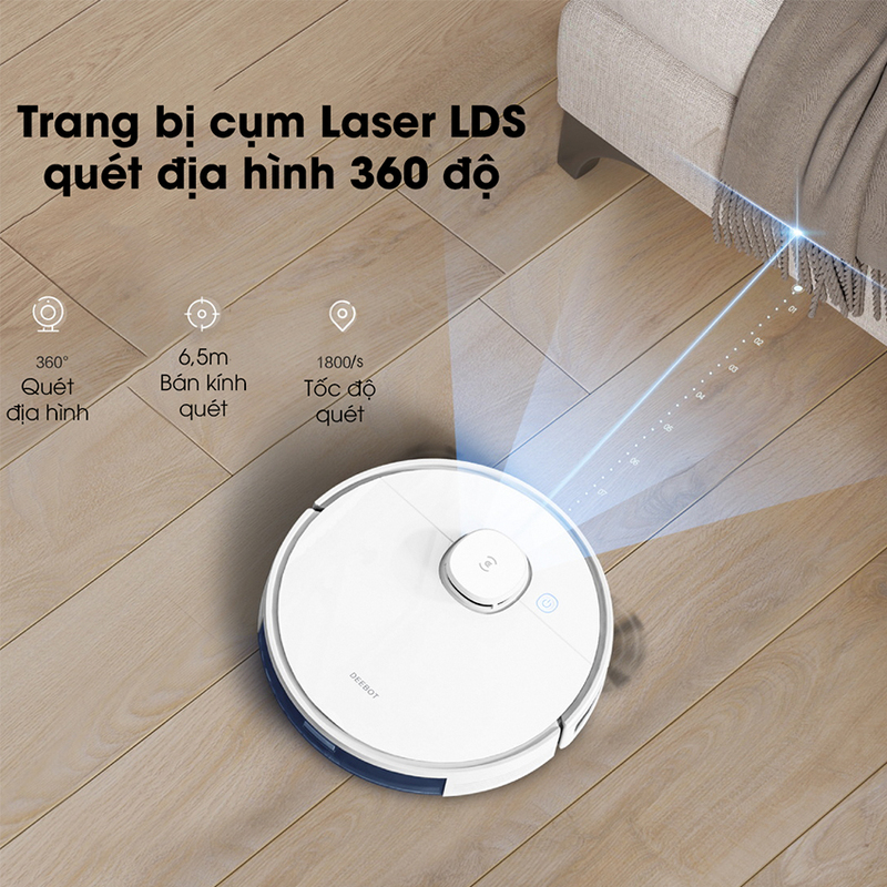 Robot hút bụi lau nhà Ecovacs Deebot N8 Plus được trạng bị cụm LASER quét địa hình 360 độ, bán kính quét lên đến 6,5m giúp robot nhanh chóng nhận diện sàn nhà dọn dẹp và lên kế hoạch dọn dẹp một cách thông minh. Cụm LASER quét địa hình 1800khung hình/s giúp robot định vị khu vực đã dọn dẹp và chưa dọn dẹp, tự động về sạc khi đã hoàn thành công việc. Sản phẩm robot hút bụi lau nhà Ecovacs Deebot N8 được trang bị viên pin 3200mAh hoạt động liên tục đến 110 phút. Robot chỉ mỏng 9.3cm dễ dàng di chuyển và làm sạch mọi vị trí trên sàn nhà.