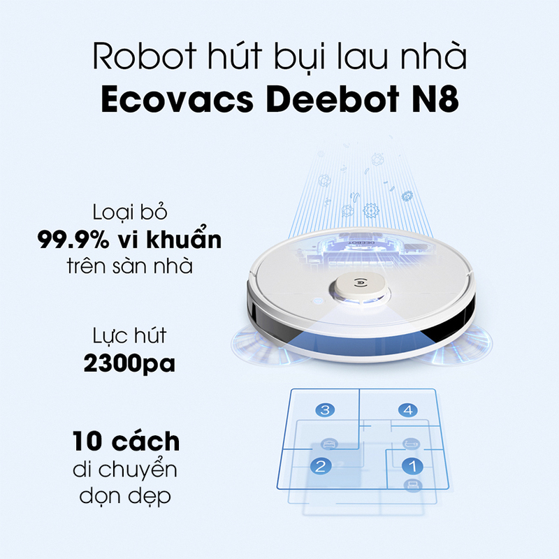 - Robot hút bụi lau nhà Ecovacs Deebot N8  Pluslà mẫu robot được trang bị tính năng khử khuẩn đầu tiên trên thế giới, loại bỏ 99.9% mạt và vi khuẩn trên sàn nhà