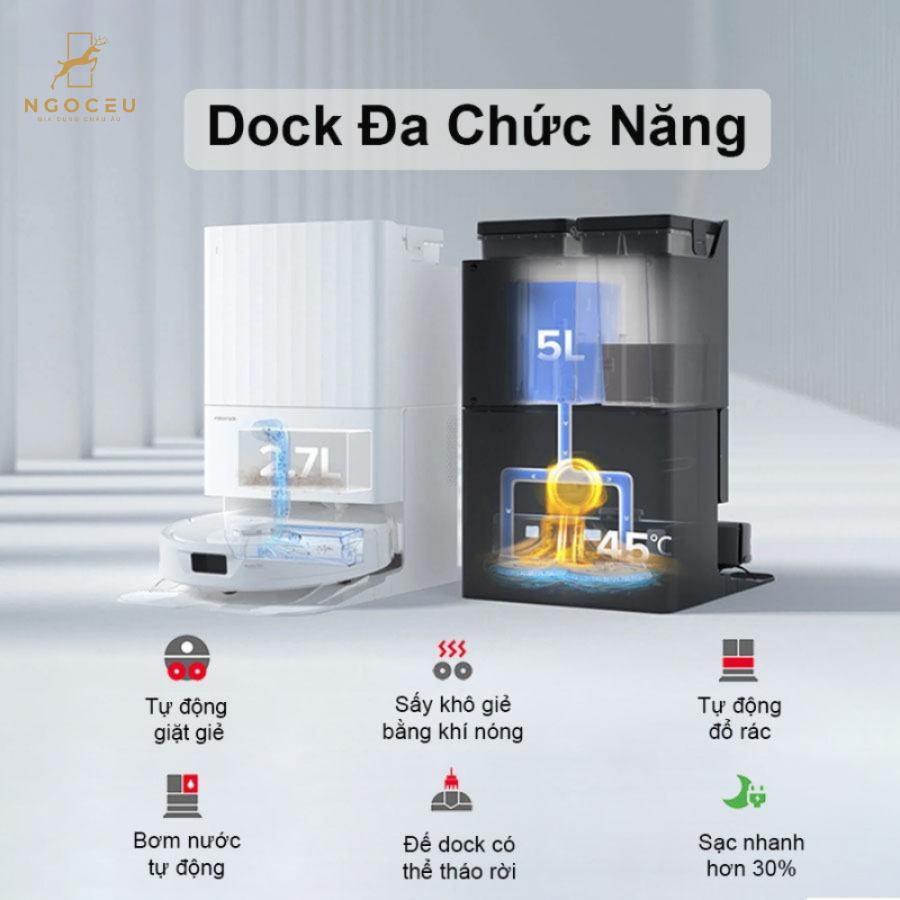 - Trạm sạc đa năng tự động hoàn toàn: tự động đổ rác, tự động giặt và sấy khô khăn lau, tự động bổ sung nước sạch, đế sạc có thể tháo rời dễ dàng, cung cấp khả năng sạc nhanh hơn 30%.