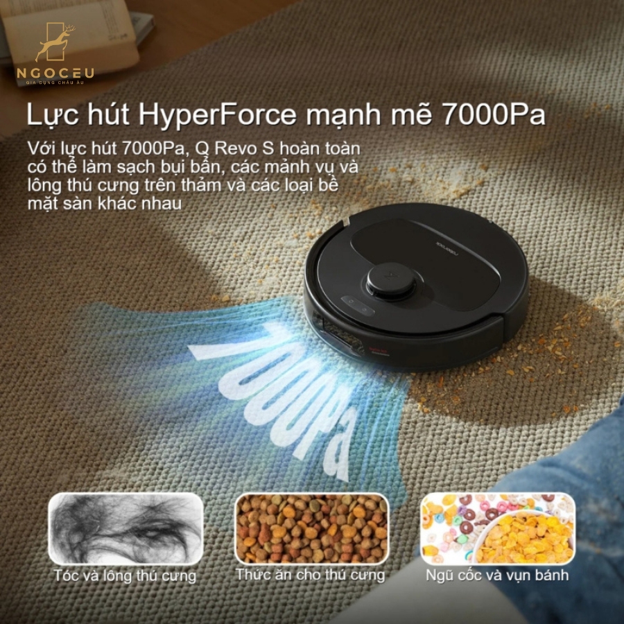 - Lực hút HyperForce cực mạnh 7000Pa: Một điểm nổi bật khác là **lực hút HyperForce** lên tới **7000Pa**, giúp Roborock Q Revo S dễ dàng hút sạch bụi bẩn, tóc và lông thú cưng một cách hiệu quả. Robot còn được tích hợp công nghệ hút với nhiều cấp độ điều chỉnh, cho phép người dùng tùy chỉnh lực hút tùy theo loại bề mặt. Khi di chuyển trên sàn gỗ hoặc sàn gạch, robot có thể sử dụng mức lực hút nhẹ nhàng hơn để tiết kiệm pin. Ngược lại, khi làm sạch trên thảm hoặc những khu vực có nhiều bụi bẩn bên trong các khe kẽ, robot sẽ tự động tăng lực hút lên 7000Pa để đảm bảo hiệu quả làm sạch tối ưu.