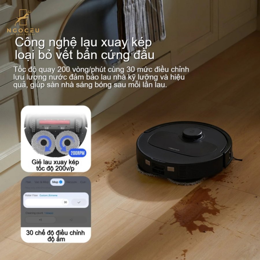 - Công nghệ lau xoay kép và điều chỉnh độ ẩm giẻ lau: Với **công nghệ lau xoay kép** và tốc độ quay 200 vòng/phút, Roborock Q Revo S mang lại khả năng làm sạch kỹ lưỡng trên mọi loại bề mặt. Bạn có thể dễ dàng điều chỉnh độ ẩm giẻ lau với 30 mức khác nhau, đảm bảo phù hợp cho từng điều kiện mặt sàn. Công nghệ này giúp loại bỏ các vết bẩn cứng đầu mà không làm hư hại đến bề mặt sàn.