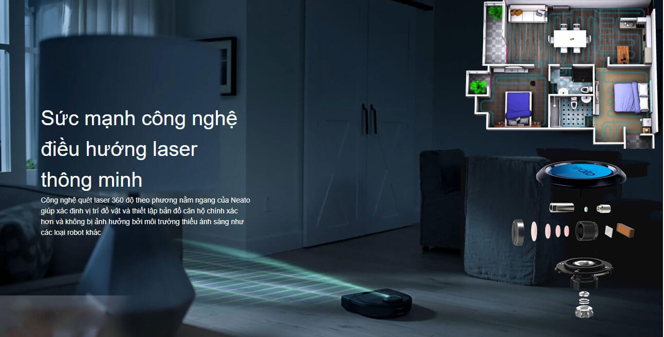 Sức mạnh công nghệ điều hướng laser thông minh. Công nghệ quét laser 360 độ theo phương nằm ngang của Neato giúp xác định vị trí đồ vật và thiết lập bản đồ căn hộ chính xác hơn và không bị ảnh hưởng bởi môi trường thiếu ánh sáng như các loại robot khác