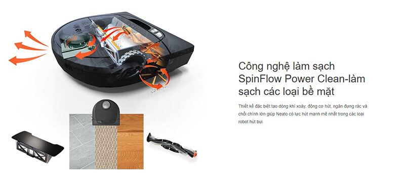 Công nghệ làm sạch SpinFlow Power Clean-làm sạch các loại bề mặt. Thiết kế đặc biệt tạo dòng khí xoáy, động cơ hút, ngăn đựng rác và chổi chính lớn giúp Neato có lực hút mạnh mẽ nhất trong các loại robot hút bụi.