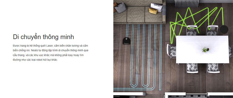 Được trang bị hệ thống quét Laser, cảm biến chân tường và cảm biến chống rơi. Neato tự động lập trình di chuyển thông minh qua cầu thang, và các khu vực khác mà không phải loay hoay tìm đường như các loại robot hút bụi khác.