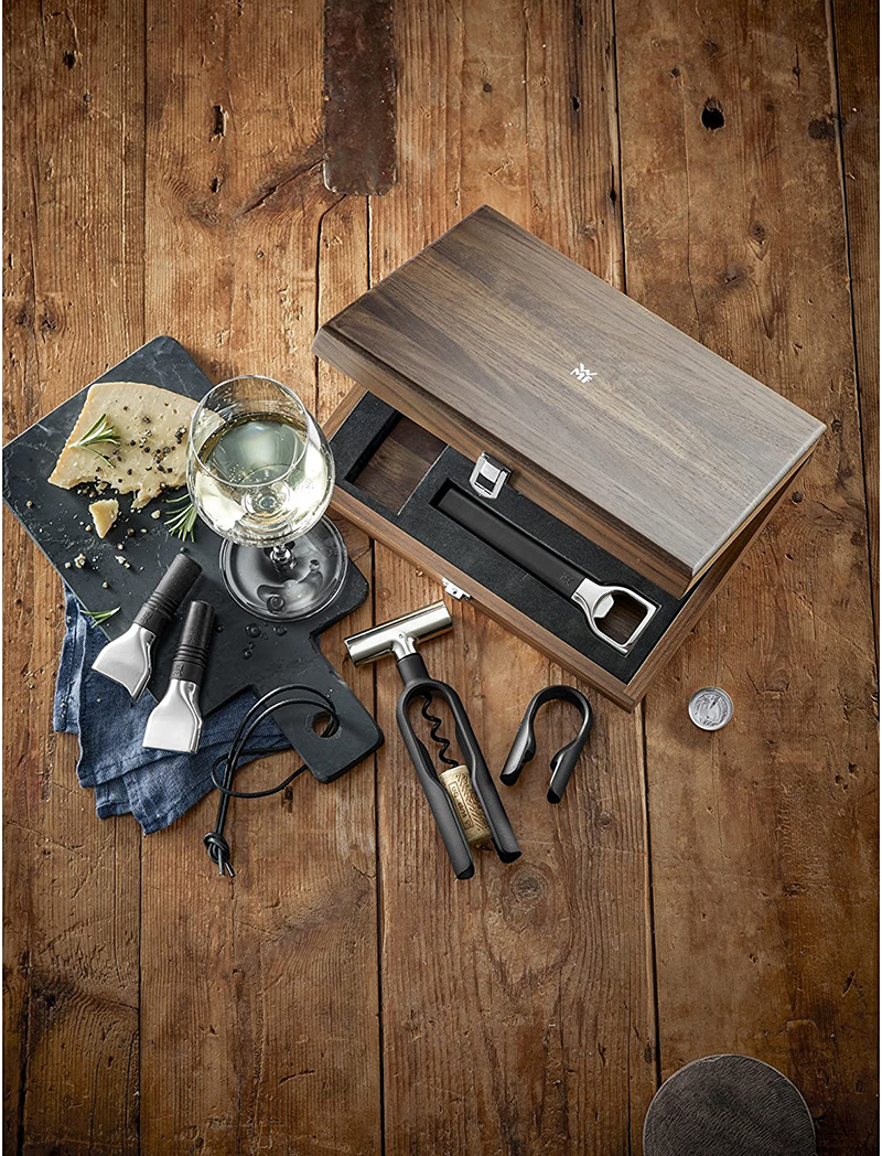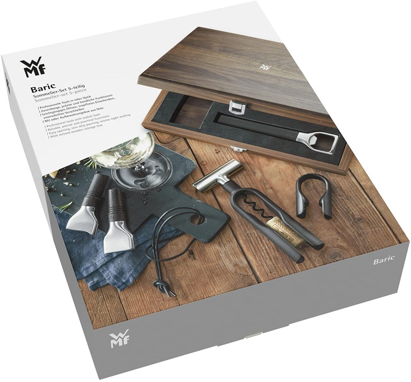 Những người pha rượu chuyên nghiệp và những người sành rượu bình thường đều biết cách tận hưởng những gì tốt đẹp nhất trong cuộc sống. Và để thưởng thức ngay cả loại rượu bình thường nhất cũng phải tuân theo một nghi lễ nhất định, theo đó WMF đã tạo ra bộ 5 món Baric. Bộ dụng cụ mở rượu vang WMF hoàn chỉnh với các phụ kiện chuyên nghiệp dành cho những người yêu thích rượu vang và trong một hộp gỗ óc chó có khóa, trang nhã và sang trọng.