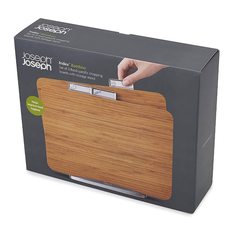 Index Bamboo bao gồm ba thớt dành riêng cho thực phẩm với giá đỡ bằng kim loại chắc chắn. Mỗi thớt được làm từ tre tự nhiên, cứng và có ký hiệu dùng riêng cho từng loại thực phẩm nào nên được sử dụng , thịt sống, thực phẩm nấu chín hoặc rau. Mỗi khe cắm bảng an toàn trên giá đỡ kim loại cũng có chân chống trượt. Kích thước bảng: 25,5 x 35,5 cm (10 x 14 inch). Được thiết kế bởi: Damian Evans