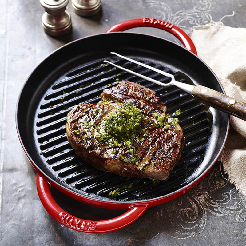 Chảo gang nướng của thương hiệu Staub chuyên dụng để chế biến các món áp chảo hay nướng.