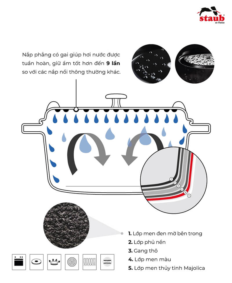 Nồi gang Staub được sản xuất hoàn toàn tại Pháp, bằng việc kết hợp giữa các yếu tố truyền thống và hiện đại, mang đên cho bạn những trải nghiệm tuyệt vời khi chế biến các món ninh, hầm, áp chảo. Thiết kế sang trọng, đẹp mắt, nổi bật khi sử dụng để trưng bày trên bàn ăn. Bên trong nồi được phủ lớp men đen, giúp hạn chế trầy xước và món ăn trở nên đẹp mắt hơn. Bên ngoài được phủ men thuỷ tinh, đảm bảo bền màu, hạn chế trầy xước. Núm nắp nồi được làm bằng niken với khả năng chịu nhiệt lên tới 250 độ C. Sử dụng được trên mọi loại bếp, kể cả bếp từ. Có thể vệ sinh bằng máy rửa chén.